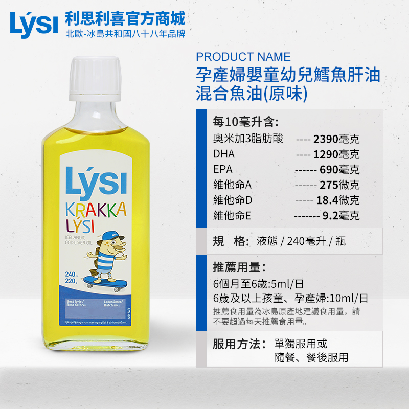 Lysi利思利喜冰島進口嬰幼兒孕婦天然深海金槍魚鱈魚混合魚油原味 240ml*2瓶