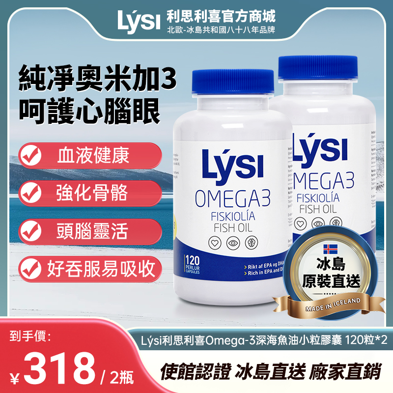 Lysi利思利喜冰島原裝天然奧米加3深海魚油膠囊成人中老人通血管 120粒*2瓶