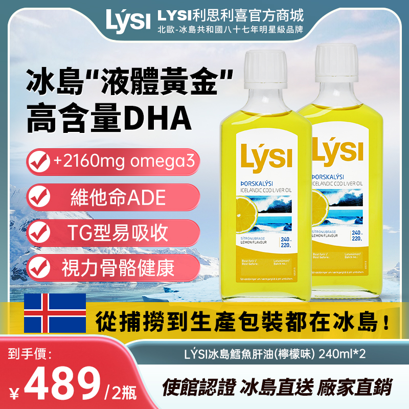 LYSI利思利喜冰島原裝天然魚肝油奧米加3深海鱈魚油高含量DHA EPA 240ml*2瓶